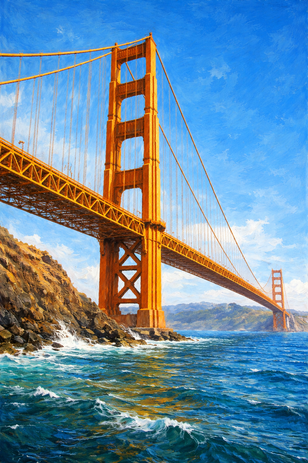 The morning light found Dav trekking the Golden Gate Bridge by foot, heading north. He paused and considered the high red-orange pylons overhead, before looking down at the water swirling around the gigantic bridge foundations below.